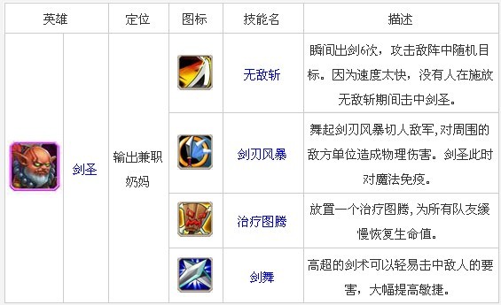 剑圣技能总评:敏 捷英雄,前排输出,剑圣似乎不论在哪里都是十分逆天的存在,无敌斩有暴击加成,打在一个目标上就各种秒的节奏,剑刃风暴附带魔免的范围攻击,治疗图腾全体 回血,剑舞大大提高敏捷和攻击力,这样一系列变态技能,让剑圣都是无悬念的现版本第一菜刀。所以这样让敌人面红心跳的四个技能,还不点满么?