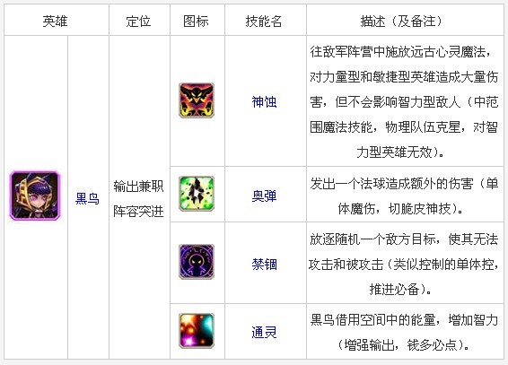 总结:许 多玩家的首抽英雄,法力输出相当高的法系英雄,拥有的大招神蚀,对物理系英雄杀伤极大,可谓是物理系英雄的克星,而且其奥弹技能伤害也是各种切脆皮的。缺 点也是同样明显的,黑鸟的禁锢毫无智能性,完全看脸,经常能坑死你;大招对智力系英雄无效,也非全屏;攻击前摇长,容易被一班打中排选手不停打断释放不出 来。一个优势和劣势都很突出的英雄,使用培养需斟酌。