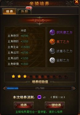 主角流对其他的英雄只会做必要的培养,主要任务是培养主角,对主角的培养,主要是培养主角的坐骑、装备、女神。提升主角最主要的是提升坐骑,提升坐骑需要用到的有灵魂石,祝福石。为了利用好有限范围内的石头,建议玩家先将石头给主角用。对于主角流,主角输出能够给主角带来更高的攻击力,同时还能使主角站得更久。强化装备可以为主角带来更多的主角输出,但是主角输出不可以全凭主角,还需要借助女神,女神能提供最多的主角输出,前几阶女神的主角输出没有多大差异,过渡到战斗女神后就要对女神进行培养,不断升级女神,叠加女神圣衣的属性,是女神提供更多的女神输出。