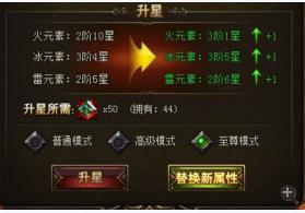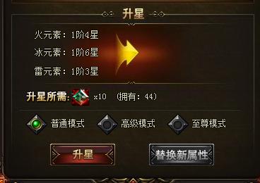 对元素进行培养分三种模式,分别是普通模式,高级模式和至尊模式,普通模式和高级模式都既可以升级也可以降级,但至尊模式只可以升不可以降。