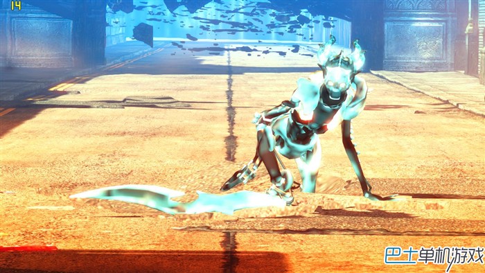 拿到钥匙,回到原来的路线,一直跟随之前那只小老鼠前进,来到这里,它变身了!变成一个刺猬了!它变异会有两个阶段,一个是变成大型白色的刺猬,二是 图上所示全身发亮。它只会受到浮空打击,所以使用镰刀对付它最好不过了。但是在它发亮的时候,你最好和它保持距离,而且它会释放和前面关卡中出现石头碎片 轮盘类似的刺猬轮盘,你可以使用枪击碎。