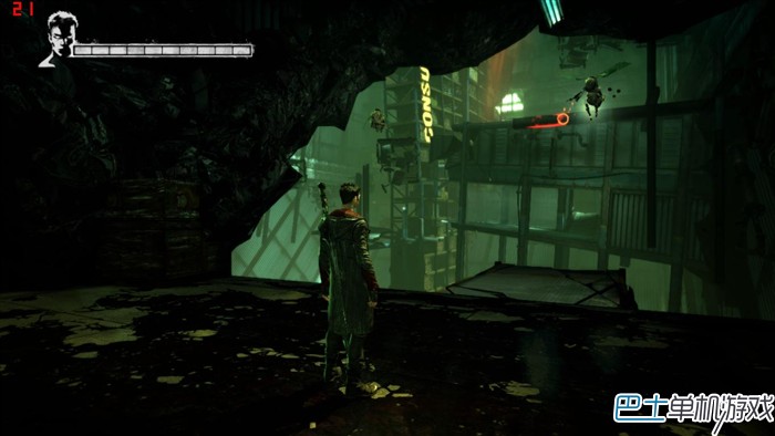 到达这里,要连续跳过好几个前面那样的铁网平台,看起来好像很简单,其实当你跳上去后,新闻塔就会放出一道圆柱型光纤,光柱经过的地方,铁平台会被摧 毁,你触碰到也会被攻击受伤。所以你一定要讲求速度蹦过去。再跳完图上前面这两个平台之后,你就会遇到最难的一个跳跃。因为光柱就跟在你屁股后面了,你会 先使用圣蛇鞭蹦到一个废旧车厢上,然后光柱会将车厢慢慢摧毁,当车厢开始倾斜的时候,你一定要掌握住这个时机,二段跳加上飞翔,落地立刻再重复下这个动 作,这样才能摆脱光柱的攻击。后面就比较简单的几个牵引了。