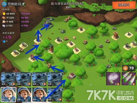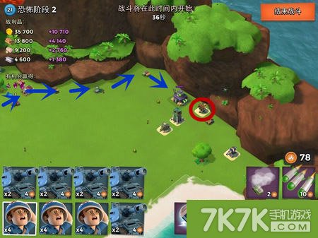 低本玩家推荐使用胖子+MM,直接上去拆建筑,这关的防御武器都很弱,不会对部队产生太大伤害。