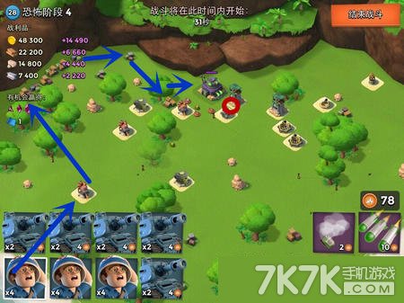 低本玩家推荐使用胖子+MM,炸掉小加农炮和哨兵塔,然后部队从左侧上去拆建筑和箱子收集能量,最后再去拆基地。