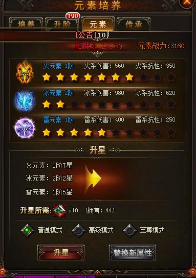第三种是建议3阶以上的玩家使用的至尊模式,它很低可能会减少其他元素的级数,不过这种模式培养一次花费比较高,1次培养需要用元素粉尘50个。越到后面,升星的几也会率越低,但对于3阶以上的玩家,选至尊模式依然是很值的。