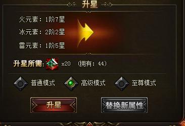 第二种是高级模式,和普通模式一样,可能会使其他元素的级数下降,但是相对于普通模式来说,提升某一种元素的几率比较高,不过升阶效果好不好好,很大程度上由运气决定,如果运气差。可能很多次都不可升,所以建议1、2阶的玩家使用。