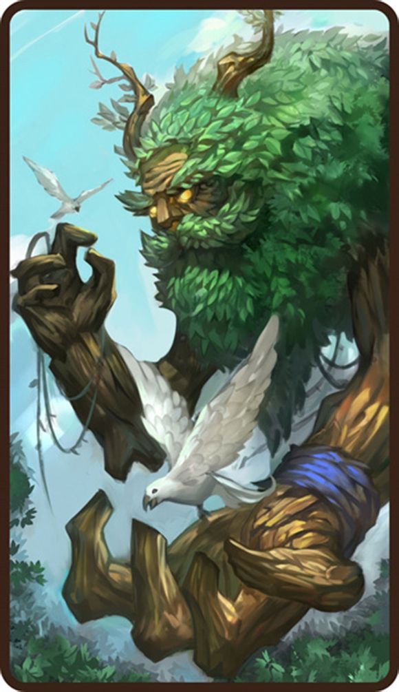草木皆兵(大招):树精从敌人面前消失遁走,并在战场后方化为一颗大树。大树形态下可召唤3种植物助战。当树精卫士在满能量状态下,释放大招,会化身为一个大树,并定位在战场后方。