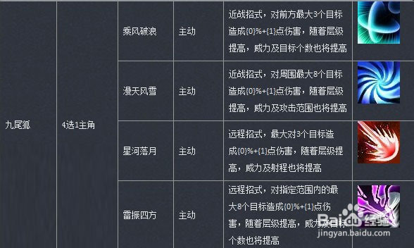 其九尾技能的过人之处有两点,一是速度,二是暴击,这两个功能综合在一起就可以称得上绝世高手了。除了以上突出的特点之外,九尾还有其他四个厉害的技能,其分别为乘风破浪、漫天飞雪、星河落月和雷震四方。其中的前两点技能可以统称为近战技能,后两点可以统称为远战技能,有了这四个技能,玩家们就可以近战远战技能并使,再也不用担心有弊病的问题了。所以玩家们用心把九尾的技能熟络于心,在作战的过程当中加上一些技巧,那么在射程之内的敌人必能遭受重击,玩家们就可以暗暗得意的啦!