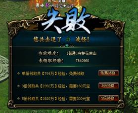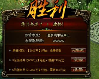 当30波怪物全部被你击杀结束并且玩家的基地血量不为0时就说明你挑战成功了,如果你在塔防的过程中血量被损耗到0则被视为是挑战失败。玩家在通关成功后领取奖励时,可以免费领取单倍奖励,当然了有一定资金基础的玩家也可以通过消费元宝来领取多倍奖励,多倍奖励自然更加吸引人。如果玩家在塔防总波数没有结束的时候点击并确认退出了副本,之后会弹出战斗失败的领取框,也可以进行单倍和多倍奖励领取。当然了,还有一个秘密法宝,无论在什么时候玩家只要点击一键通关,都会被给予完美经验和灵气的奖励。
