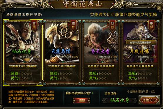 如果是刷新到其他品质,玩家只要点击开始守卫按钮也是可以自主进入副本的。当然你也可以用500元宝直接买通进入最高难度副本,副本的难度不同的区别在于所遇到的怪物的血量防御和加成值,挑战的难度越高相对应的奖励也会越来越丰厚。