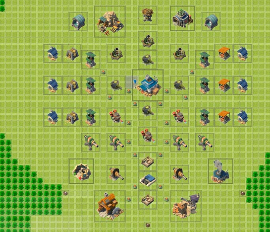 这种阵型的摆法是比较其他的,既不是躲角阵也不是压岸线,只是单纯的将大本保护在中间,这种方法相信各位玩家们很多都在使用吧,虽然普通但是实用度还是非常的高的哦。