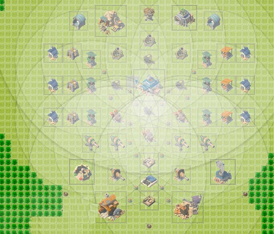 看上面的图可能还不是非常的直观,下面我们来看看这款阵型的火力分布图吧,海岛奇兵中的每件防御设施都是有攻击范围的,而这个阵型的摆放则是巧妙的将整个大本都覆盖在了火力范围之内,综合来说还是一款比较不错的阵型哦。