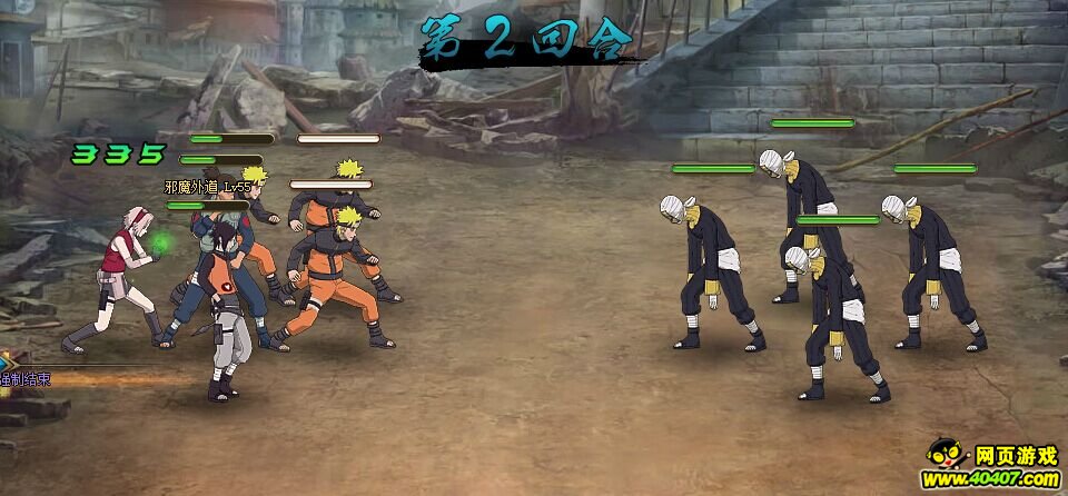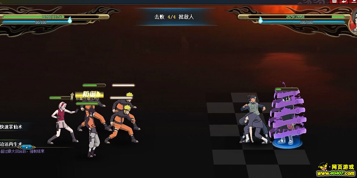 第三回合,不放任何技能,小樱看情况加血,一般是伊鲁卡快顶不住了小樱就加加血,直到这样普工搞死团藏。