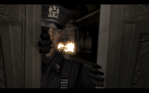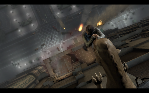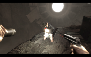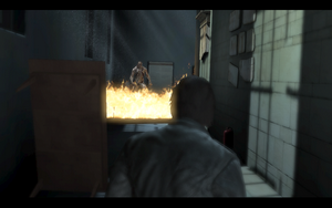 解决后继续爬上原来的断层,小心的躲过来回的石头.跳下后,拿起灭火器砸开电梯门(注意小心火男主角也不是超人).进入后与女主角相遇,美女哦~发生剧情(载自另一个攻略,另外对话很搞笑= =|)...剧情,结束后,抱女主角出去,自己跟着跳上去,从另外的电梯下去,打开电梯门,出去时记得拿警卫尸体边的手电和子弹.(场景后面后个灭火器,拿上后可以去一开始楼梯上灭火有道具拿)