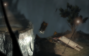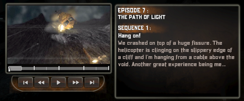 由于被空中BOSS的攻击,直升机坠毁了.然后就开始艰难的攀爬(小心落石)爬到一定高度后就有剧情.还以为人机共亡呢= =||||小心火焰 移动到左边的地铁上(物理特效极致啊!!!赞),往前移动下..就出现倾斜(靠好严重的倾斜)还好玻璃质量牢靠,抓住不知道那里来的绳子,攀爬(小心小怪),爬着爬着侏罗纪公园(貌似)某个场景重现。