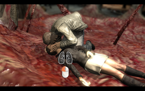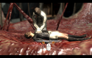 不一会女主角就醒了.Kiss了下 talk了下,后天空飞来了个很大的鸟兽(难道就素最后的BOSS么 越来越离谱了)剧情过后,男主角一人踏上孤独之路,补给+医疗后,来到大厅杀小怪+母巢.然后打下左边墙边上的电线栓后爬上2楼,打掉母巢.然后去右手边烧了木板后,进入其中。