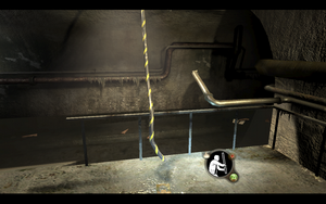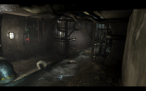 离开后,爬上绳索.就可以看到母巢了,速速灭之.下水补给后,就直接爬楼梯上去,没走多远电话就来了(里面男主角得知了自己的名字).剧情过后,一路小跑,你会发现有一个水道被电缆导电了.跳到对面的控制器,打开面板接好线,等绿灯后就没电了。