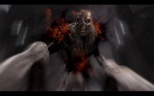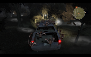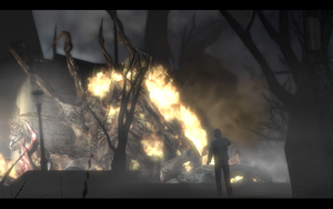 开到一半就报废了..无奈下车后取得打火机,点燃汽油后,一路小跑.途中可以发现一个白痴怪自杀.点燃车库门旁边木头,裂缝出来了,快速点燃裂缝是存活的唯一方法..不然的话就要被它SM..。