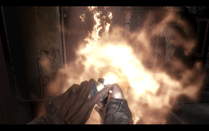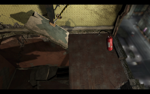 一个优雅的弧线进入炸开的门后,大家可以欣赏游戏中美丽的火焰效果前面2条路都不能走,进入身后的门.一进门遇到个求救的女子.随口打发后进入她身后的破门,拿起灭火器灭火后进入遇到另一个求救的人~拿着灭火器撞开门和女子会合,之后就原路返回灭火.