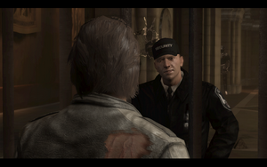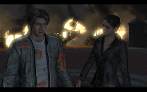 之后来到一个大厅,一场血战又开始了.多多利用掉落的武器,日本武士刀很不错威力很大,2楼后要注意3个长舌头的小怪.打完之后,和楼上的保安说话.他让你独自下楼,他却离开了.下到底层遇到熟人