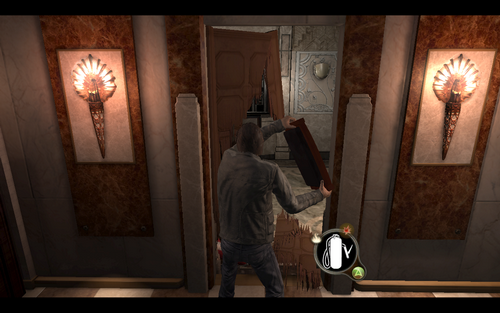 醒来后,闭眼发现柜子后面有亮光.打开后老人的幽灵为男主角开了机关.然后就又是剧情.过后拿起徽记,跑到ROOM943房门左边的地方在红叉处使用手电+徽记