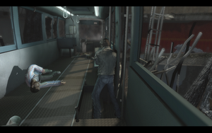 离开厕所后,先跳上旁边的绳子,然后用枪打掉另一边绳子的固定架就可以安全落下(小心蝙蝠).之后打碎玻璃下去.一直往前走,走一段路之后会看到一辆BUS.进去BUS,会发现几具尸体,把尸体往车后拖。