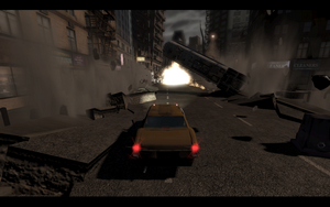 感觉是第一个让我震撼的地方(如果没有豆腐车这个设定的话会很好)这里对车技有点小小的要求,而且不要把这个游戏当极品飞车玩,米漂移.另外不要幻想自己多NB.你坐的是NY最普通的TAXI,另外小心后面那个大裂缝弹你车屁股=.=.如果老被弹就直接快进好了,或者背地形.不过还是很简单的,记住地形,全速飞驶。