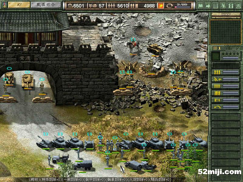 突破中门后,上面的敌军会主动进攻。原中路军主力就地防守(但要派步兵摸过去干掉火炮),半数自走炮和重步兵向左移动;原右路军半数战车和步兵进城向中部进攻,自走炮和重步兵向左门移动。