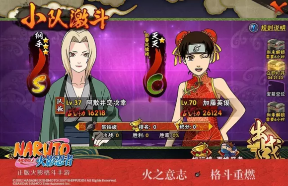 进入游戏点击小队玩法,看到小队申请界面,所有的忍者学员均可以通过加入或组建小队,来体验2V2的跨服小队激斗玩法。同小队的2名忍者学员在房间内组成临时战队,队友之间必须使用不同的忍者,准备完毕后,就可以匹配其他战队进行对战。