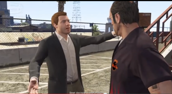 看 似普普通通的一句话,却是9年后两个至交好友的见面语。Amanda抱怨丈夫和孩子打搅了自己的瑜伽课,这时教练Fambien以“Did someone say Yoga?”的谦和声音登场。而接着以相同方式登场的确是Trevor。这个重逢实在太戏剧性了,如果说Trevor在Sandy Shore清剿The Lost Mc反应他暴力血腥的倾向,那么这次在Los Santos登场就体现他性格的另一面-霸气下的幽默。