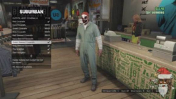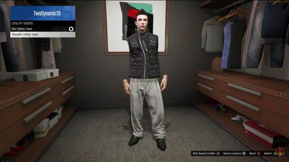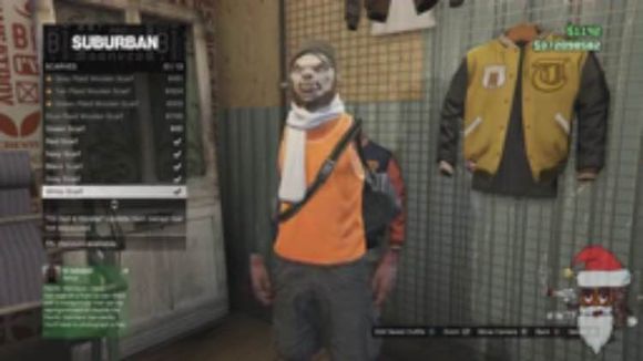 然后走到套装,选抢劫的那一套(如图),然后穿上之后,选择围巾、会发现你换穿着背心