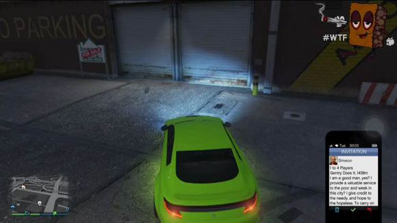 然后当你把车开进车库时,迅速打开菜单加入你基友战局,然后界面显示你是否加入这个战局,这个时候就让你基友退差事,突然你的界面也会发现,差事已解除…然后被踢出云外,然后迅速倒车,倒到外面来…汽车就无敌啦!