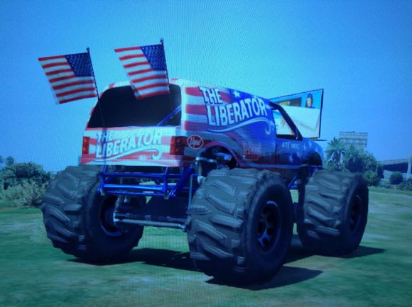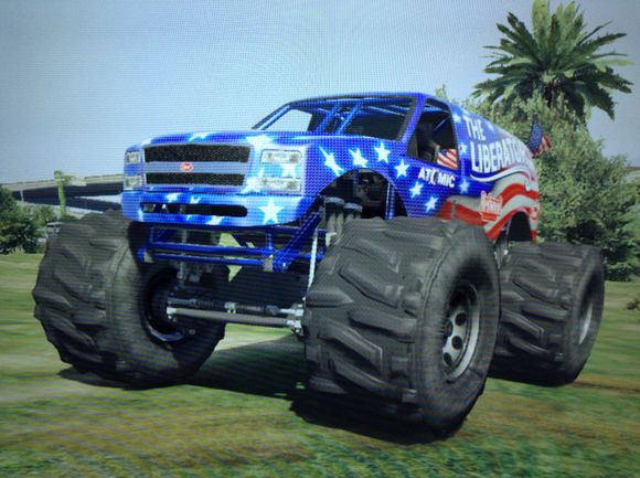 这 辆大脚车和美国独立日那辆送的威皮 解放者有得一拼,灵活度特别强,要比解放者更加能上山下地。速度也是还行的,至少我在开这辆车走遍马路碾过车辆的时候是极其顺畅的,没有撞到车辆后停下的 情况,而是直接从车顶溜过去。而且这车的涂装是国家主题,在机库选择马绍尔的时候会有多重国家主题让你选择,此车的车体原型就是斗牛士,一辆小型皮卡,整 体是用钢支架弄的一个整体。此车在网站可直接购买