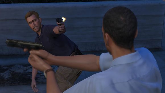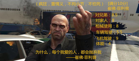 可以看到,当看见麦克和布莱德都中弹倒地的时候崔佛也十分生气,一边的打一边咒骂警察,在来洛圣都的路上,根据崔佛的自述,他以前参加过空军,但是因为精神不稳定被取消空军资格,终生停飞,但是崔佛毕竟也参加过空军,这让他的飞行技术比麦克和富兰克林都要好很多很多