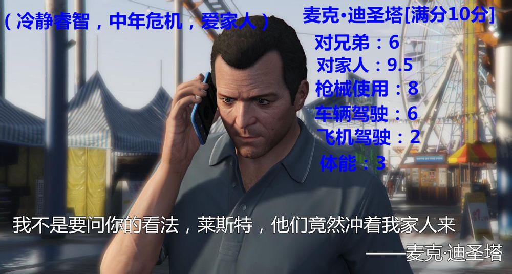 最后,细心的玩家会发现,大部分的主线故事都是围绕着麦克而展开的,如果说三主角哪个比较主要,我的回答是麦克·迪圣塔