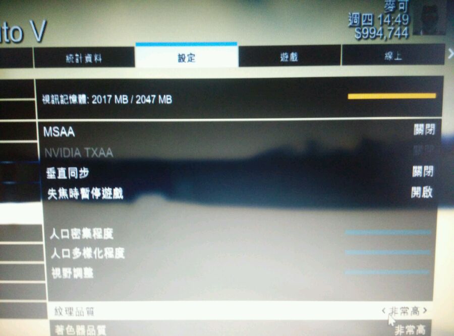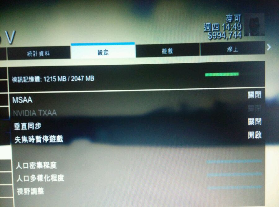 附一张锯齿图片,另外说一句,gta5有一个忽略建议的限制,如果你想提高画质就是爆显存,就打开,不想减少显卡寿命就关掉,还有,开启垂直同步会导致第二次进游戏会锁30帧,如果你的平均帧数高过30帧,你就会觉得缓慢,关掉再重新打开就行咯!