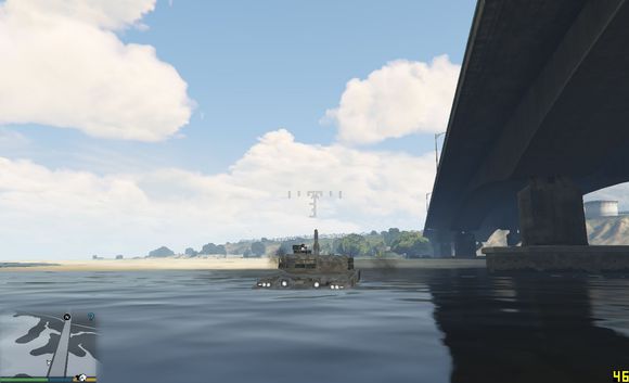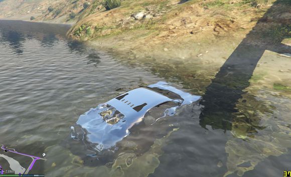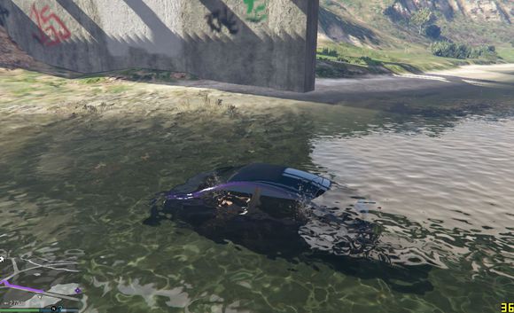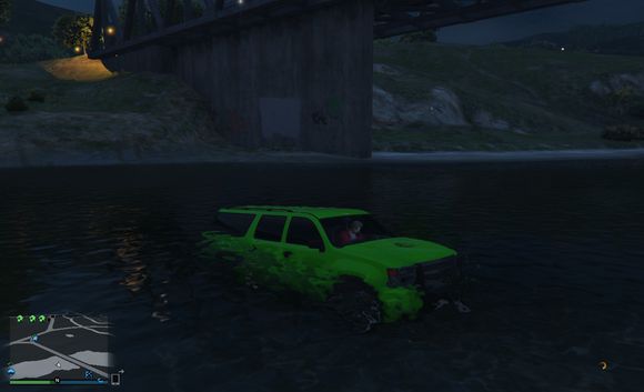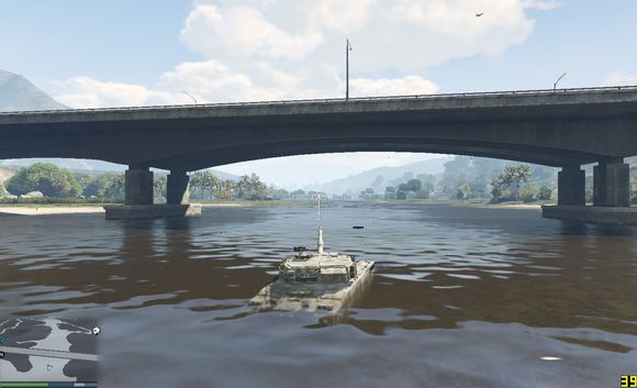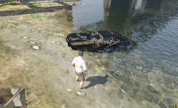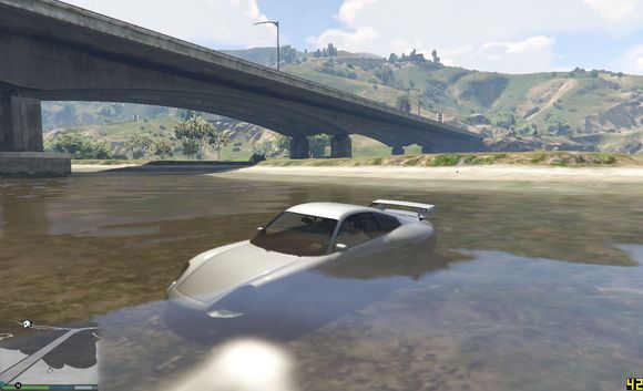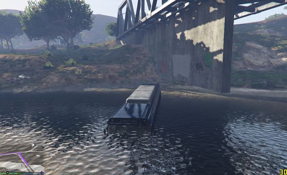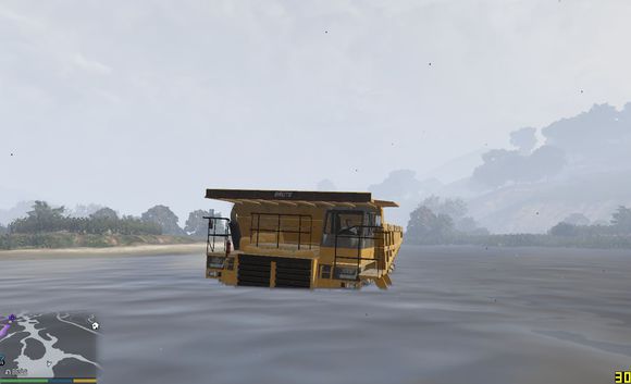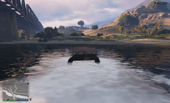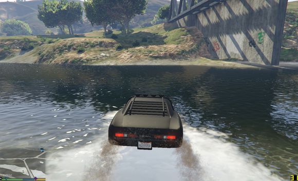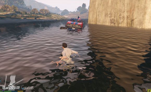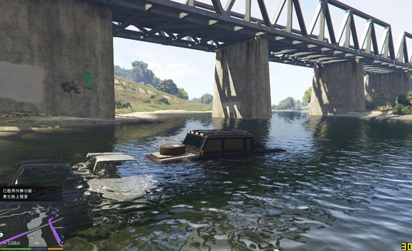 尝试快速通过,无奈车子太轻,浮在水上得不到抓地力靠惯性在水中冲到一半沉没