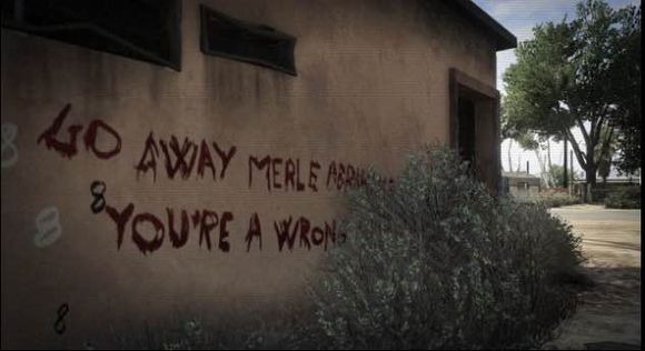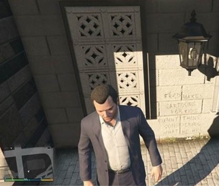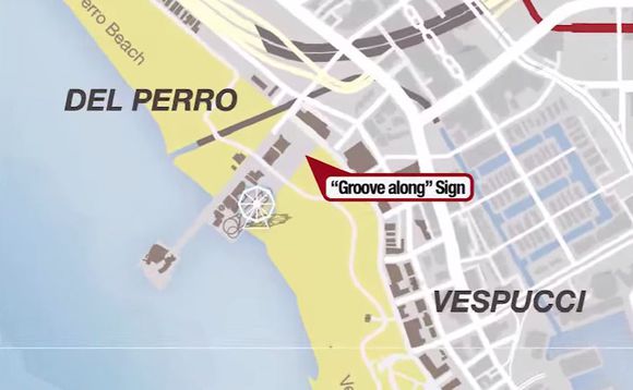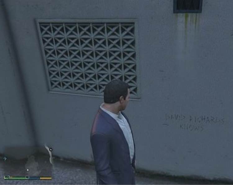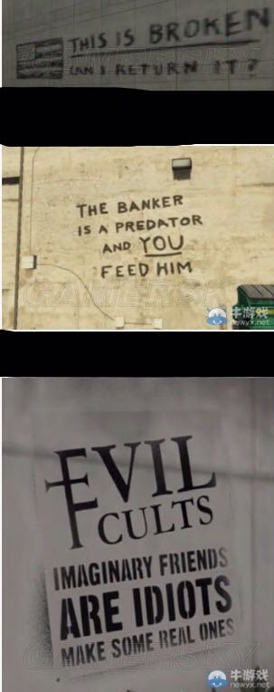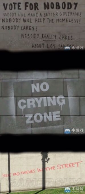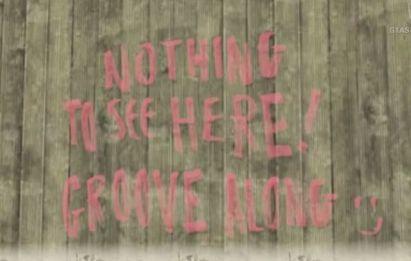 你 可以在GTA5里面看到一句类似的话 Del Perro Pier “Nothing to see here! Groove along"在Strawberry 在高速路入口的旁边 你可以看到红字写着NOTHING HERE! 在小巷子对面 可以看到用白色的笔写着”TURN BACK"