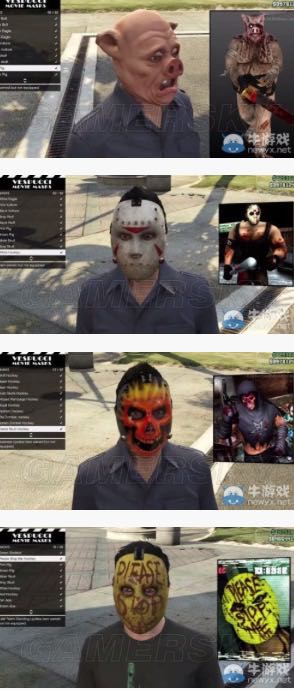 在面具店,你可以买到以下的面具,他们模仿的是侠盗猎魔里的piggsy,skins gang,innocentz gang,smileys。