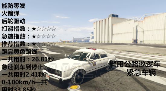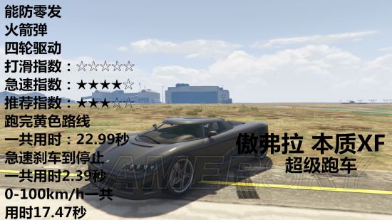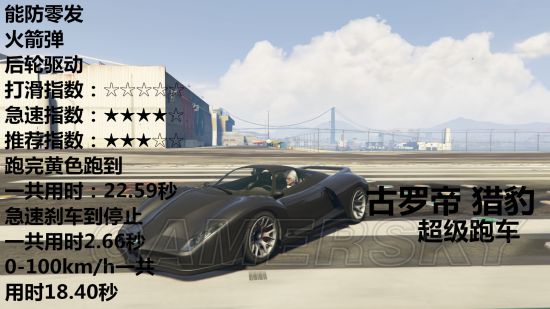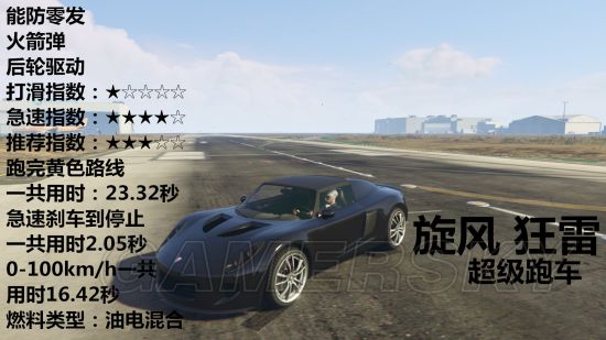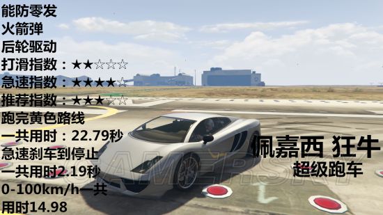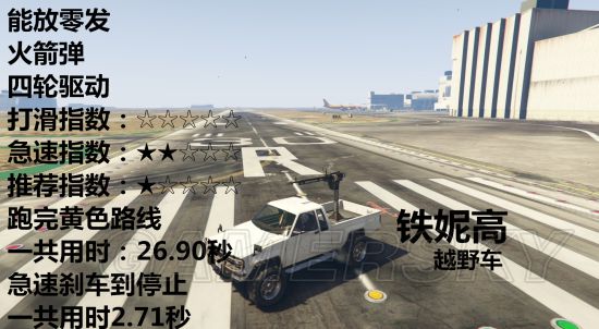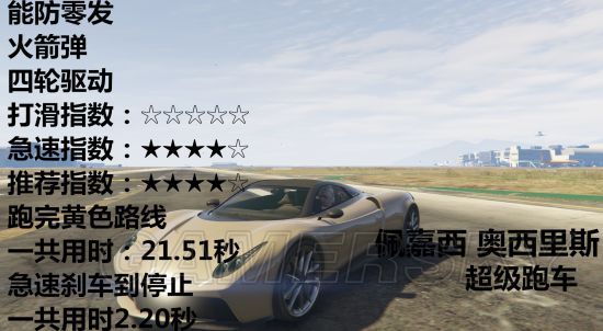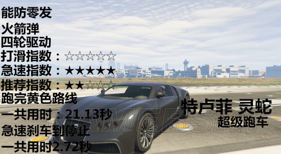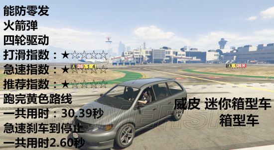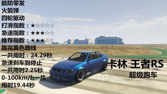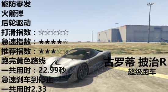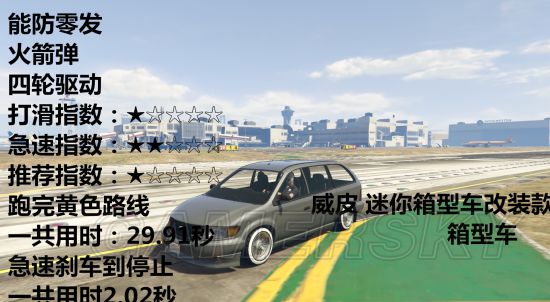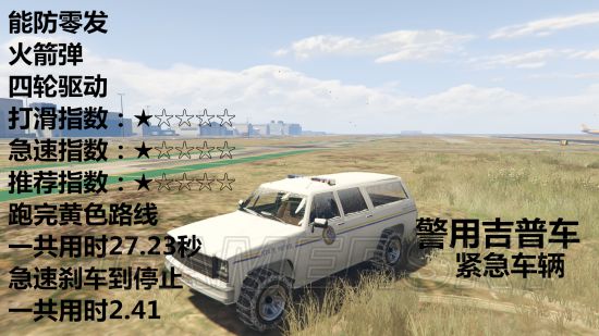 载具开到急速然后踩刹车直到停止需要多少秒、载具可以防几发火箭弹、车辆是几轮驱动、推荐指数、打滑指数、急速指数。