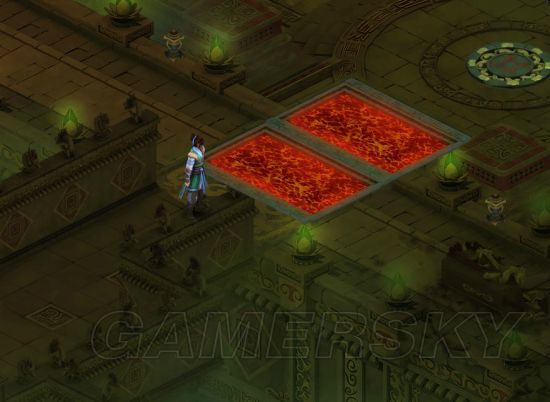 11.点亮岩浆处左右两边蓝色小灯笼,石板铺齐,踩【大圆板】,变亮,发现【夜叉区】的桥开了。先去【干达婆区】的【齿轮门】处,门开了,灭火。【干达婆区】火灭。