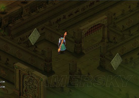 4.到【中心区域】,发现【干达婆区(双儿区)】开了,进入。发现【齿轮门】也关着,右上直行发现【大石板1】,捡不起来,做个标记@1@。遇到第一道【大闸门】,点击【大闸门】左石柱右石柱中间的门,都没有反应,做个标记@2@。走右上,出地宫。