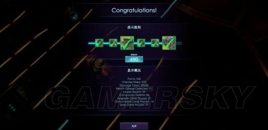在统计界面中,列出你本关获得的奖励点数,此点数可在大厅兑换成福利卡牌。