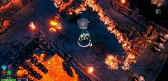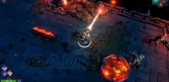 图中所示的火焰陷阱是场景中固有的,会间歇的喷射火焰,所以在移动时要留意,不要在快喷发的时候踩上去。有的时候忙于应付敌人,很容易忽略这点。