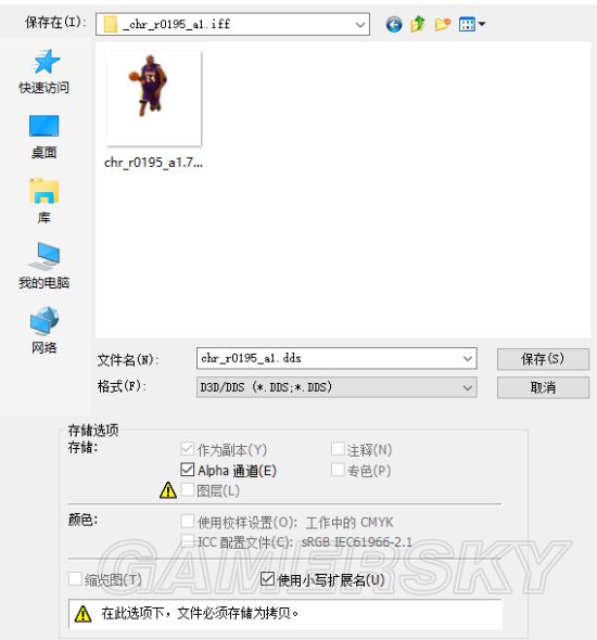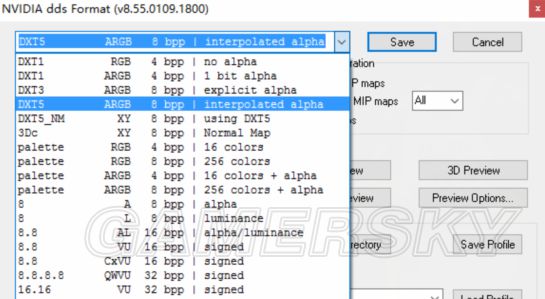 然后右侧点击通道,然后Ctrl+C复制RGB,接着Ctrl+V粘贴到Alpha 1,然后就可以左上角保存了,保存的时候注意格式:D3D/DDS,然后选择DXT5,就这样我们修改的图片做好了