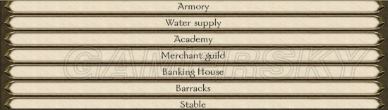 Armory:军械库,似乎是招兵必备建筑之一,建造后每周减少约300的税收
