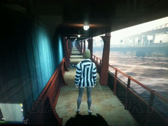 然后如果在时间不够的情况下就不要走黄线开车下悬崖了。直接从西边的高速公路走到这里就行。注意在下车时候会被一群警察围住。这时候直接把骷髅马开进河里到船附近,车子废了立刻打电话也不要保险钱。然后从河里的骷髅马中开车门上船。注意这时候开船的不要太high了,然后直接转到小沙滩上搁浅。还是那句话,细心。慢慢来。这个图是船的位置,下边的小沙滩就是小心搁浅的地方。