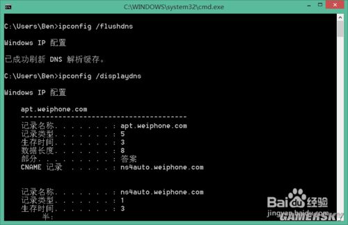 这里我们输入“ipconfig /displaydns”命令格式来查看当前的缓存的所有 DNS 记录,如图所示