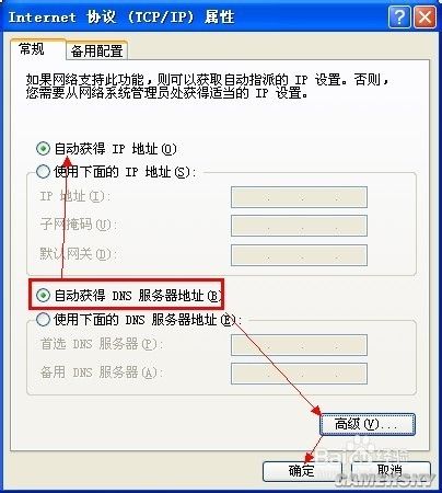 Internet协议(Tcp/IP)属性对话框的常规选项里选择“自动获得IP地址”(当然如果您知道IP与DNS信息时,您也可以选择手工输入的)。再点确定即可。