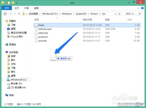 随后把修复好的 hosts 文件复制到 C:\Windows\System32\Drivers\etc 目录中,如图所示